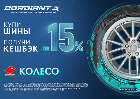 - 15% на летние шины Cordiant с 17 по 18 дюйма с 01.03.2026 г. по 30.04.2026 г. включительно;